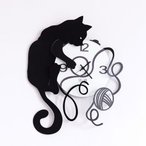 猫が毛糸玉で遊んでいるモチーフの掛け時計